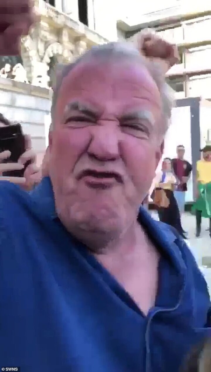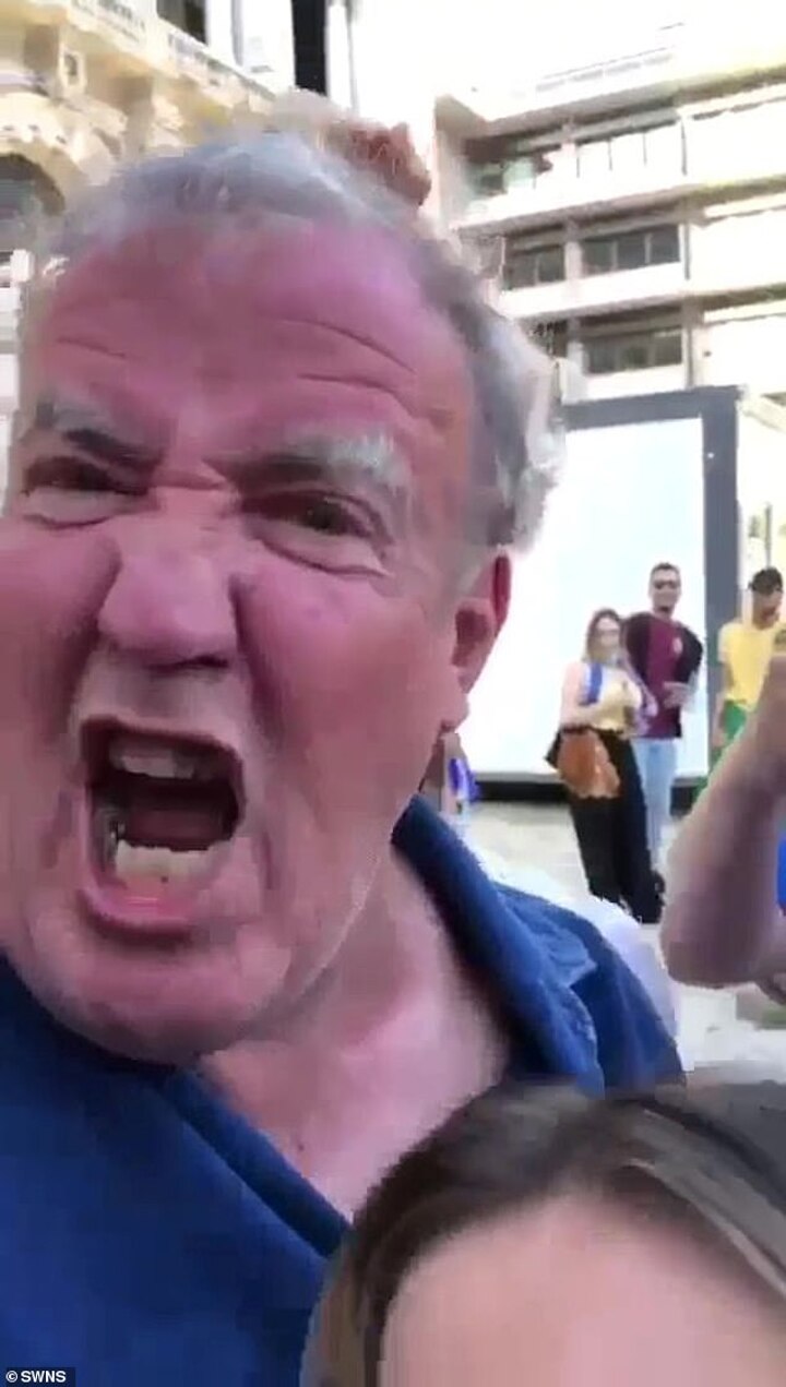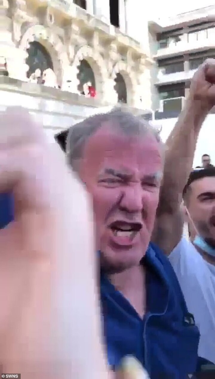 In a video of the antics, the former Top Gear host, 61, can be seen surrounded by supporters cheering 'Oh Jeremy Clarkson' to the tune of The White Stripes' hit Seven Nation Army, following his outburst.