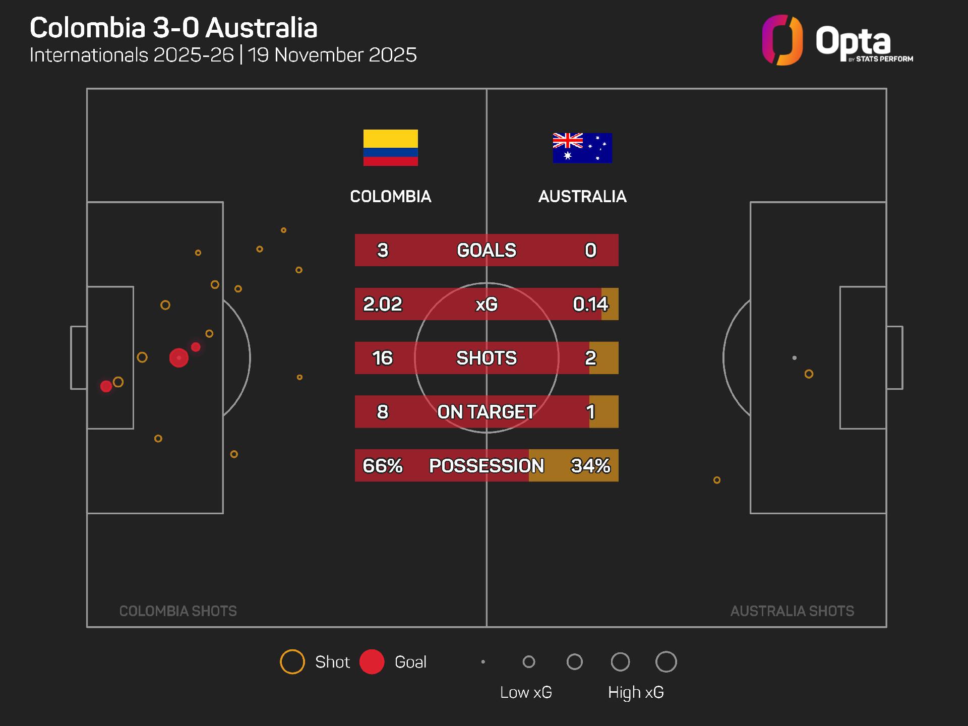 Colombia doubled their lead a minute from time when Camilo Vargas' long punt forward was not dealt with by the Australia defence, allowing Diaz to steal in and tap home.