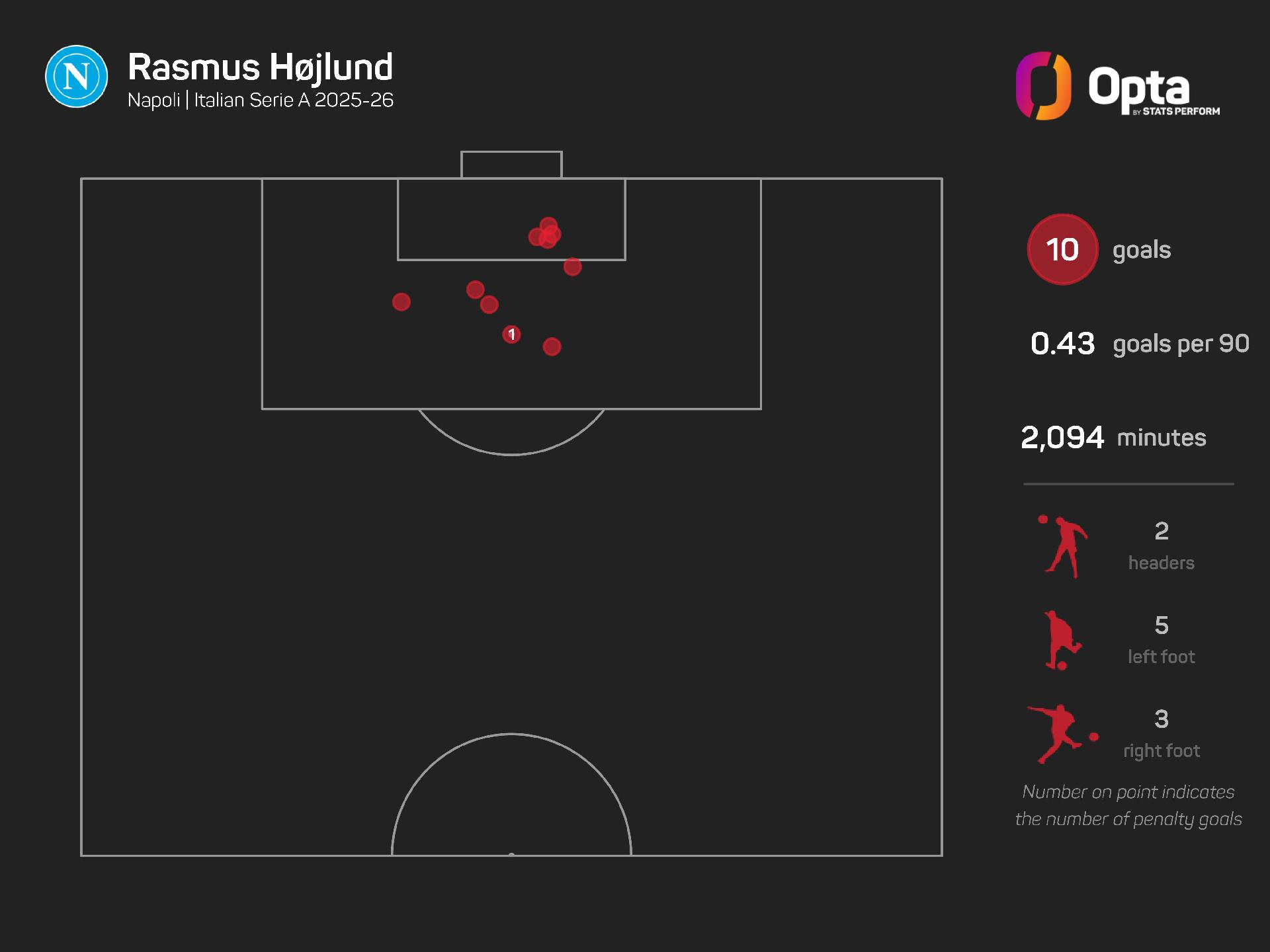 Rasmus Hojlund has scored two goals in his last three Serie A matches, as many as in his previous 10 in 2026.