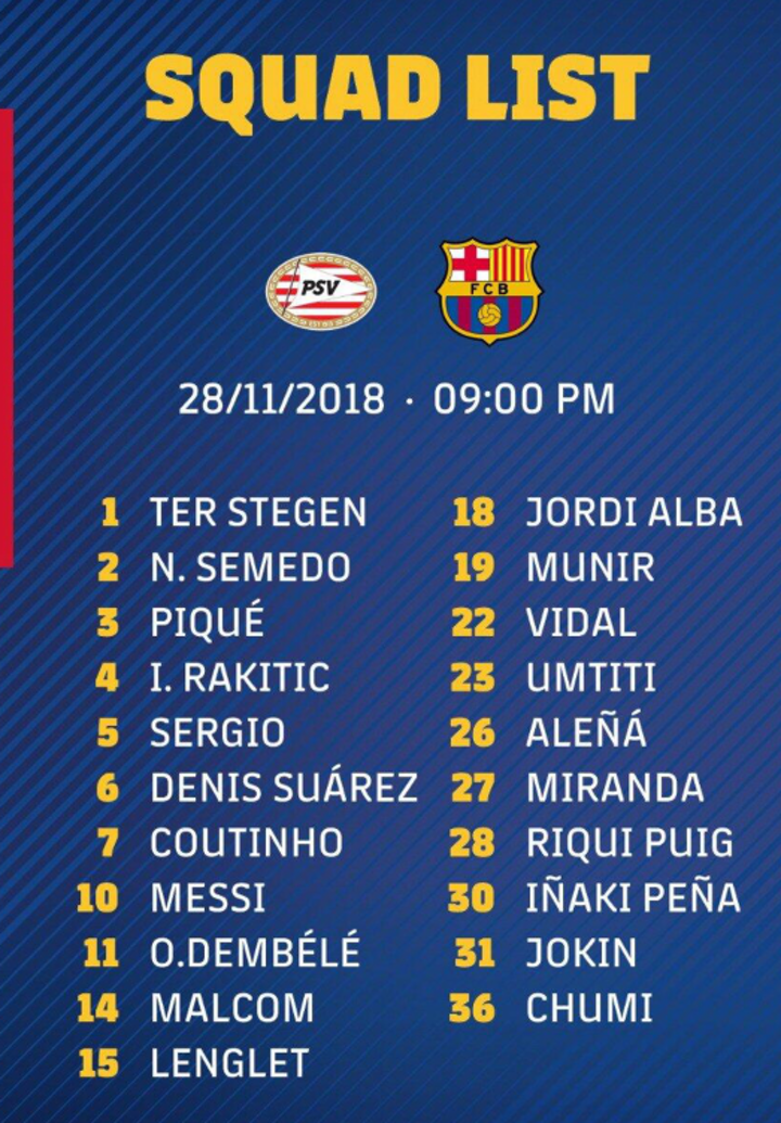 Ernesto Valverde has released his squad list for FC Barcelona's Champions League match with PSV this Wednesday. Barça have already secured their place in the knockout stages but can confirm first place in the group in Holland.