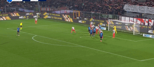 The home side almost responded immediately following their own corner kick routine, as the ball was worked around the box before a cross into the danger area, only for Federico Ceccherini’s effort to flash inches wide. Just as the Grigiorossi were growing in the contest, however, they were dealt a blow around the half-hour mark when Piotr Zieliński unleashed a thunderous shot into the top-right corner from 25 yards out.
