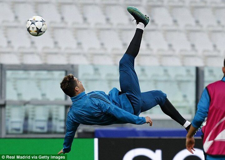 And Ronaldo was spotted practising the incredible volley the day before the match, with pictures showing him executing a near-identical effort during a Madrid training session on the Juventus Stadium pitch on Monday.