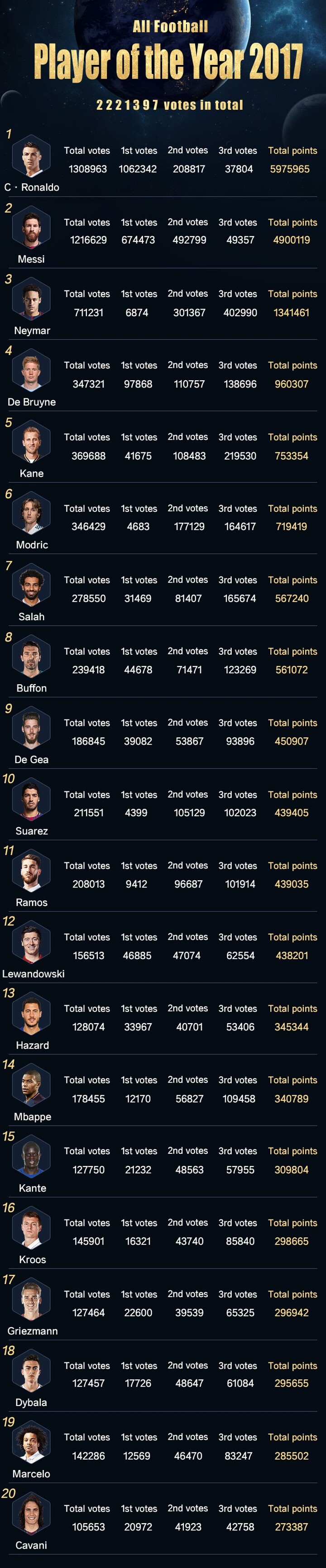 Almost 2.22 million votes were cast by fans in the All Football Players of the Year 2017 poll, with Cristiano Ronaldo receiving over 1.3 million votes worldwide.