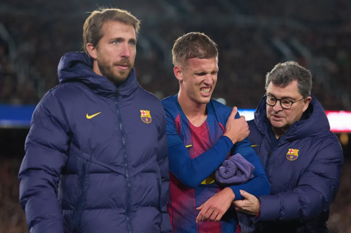 Dani Olmo was forced off just after the hour after hurting his shoulder while scoring the goal that put Barcelona 2-1 up in the match.