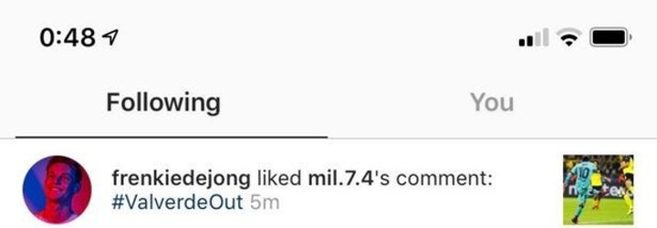 And after the match, fans were quite to spot summer signing De Jong's Instagram activity, when he 'liked' a post which simply stated #ValverdeOut.