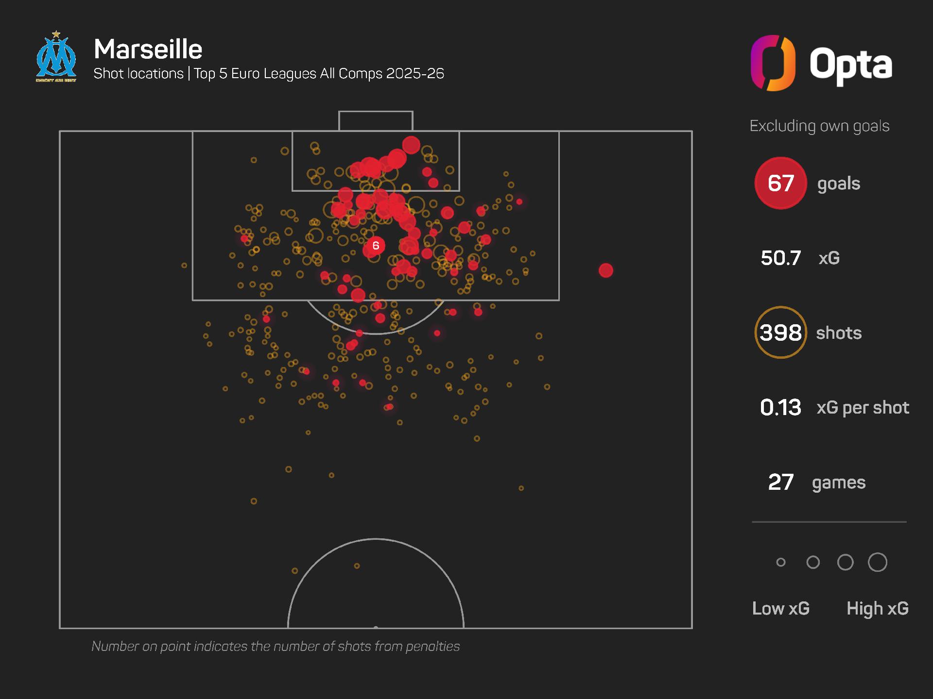 Marseille have scored 69 goals from 50.7 expected goals (xG) this season, with their +18.3 overperformance being the second-best among all teams from Europe's top five leagues.