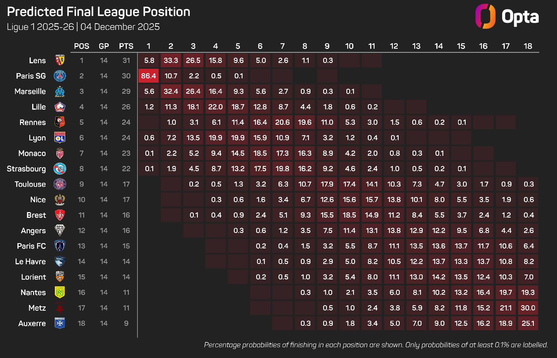 And in Ligue 1, they are given just a 5.6% chance of clinching the title according to the Opta supercomputer.
