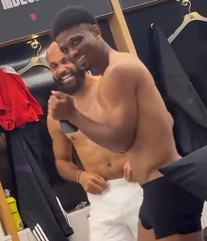 Their choreographed dance continued after the match, as Ayden Heaven captured footage of Mbeumo and Amad gyrating their hips while topless in the Manchester United dressing room.