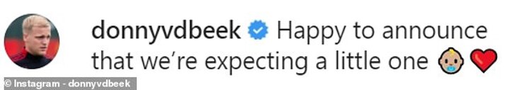 Alongside a picture of the couple together holding onto an ultrasound scan picture, Van de Beek wrote: 'Happy to announce that we’re expecting a little one.'