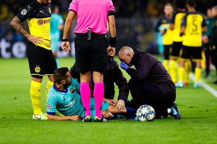 Problem for Barcelona as Alba is down with an injury, it appears to be a hamstring problem and he is replaced by Sergi Roberto.