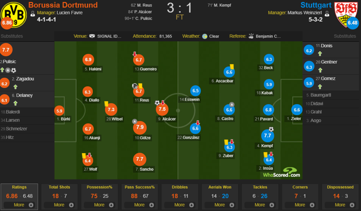 Dortmund XI: A. Witsel, M. Reus, R. Bürki, Götze, Raphaël Guerreiro, Alcácer, Wolf, Diallo, M. Akanji, A. Hakimi, Sancho