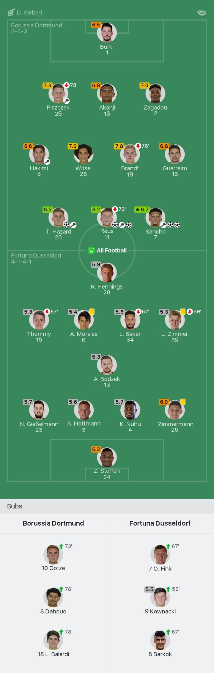 Dortmund doubled their lead when Reus gave Sancho a chance he couldn't miss, but the BVB captain was offside when played through by Brandt. It wasn't long before Dortmund did double their lead, though. Great work from Brandt once again allowed Sancho to play Hazard in on goal down the left, and the Belgium international slotted the ball home off the far post.