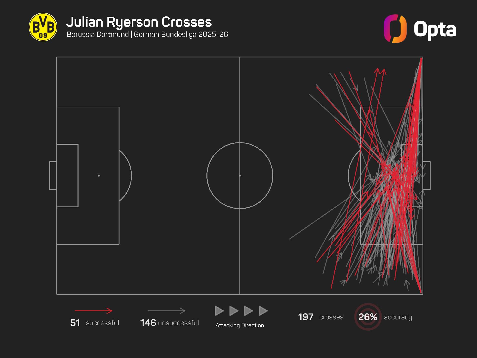Ryerson has delivered the most open-play crosses in the Bundesliga this season (122), with Hoffenheim's Vladimir Coufal delivering the second-most (120).