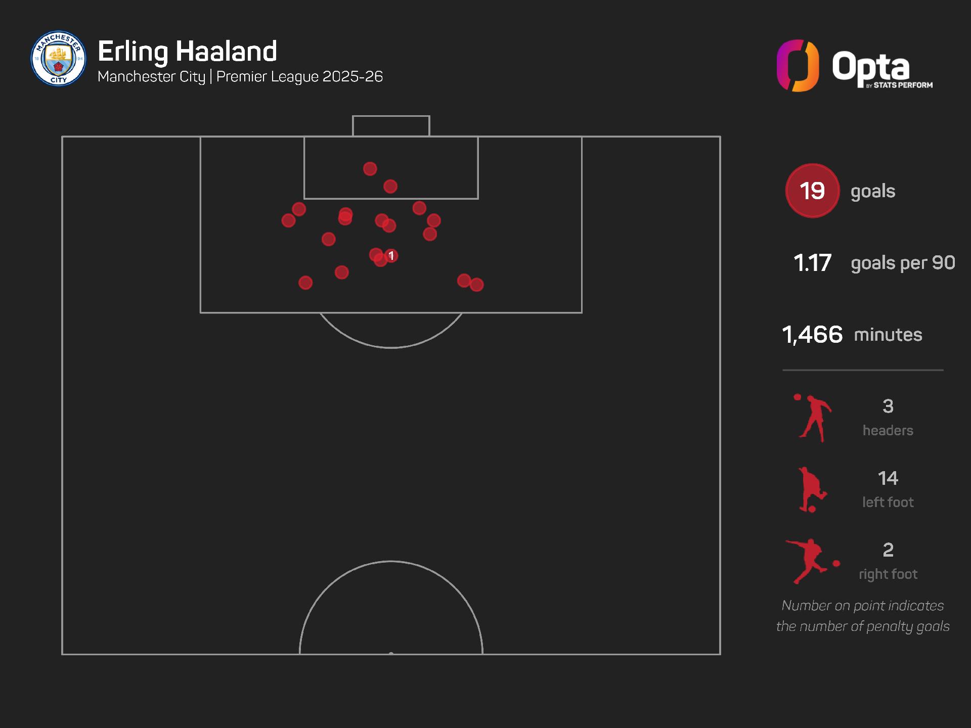 Haaland has scored 19 goals in 17 Premier League games for City this season. The only player in the competition's history to score 20 before the end of the year in a campaign is the Norwegian himself (21 in 2022-23).