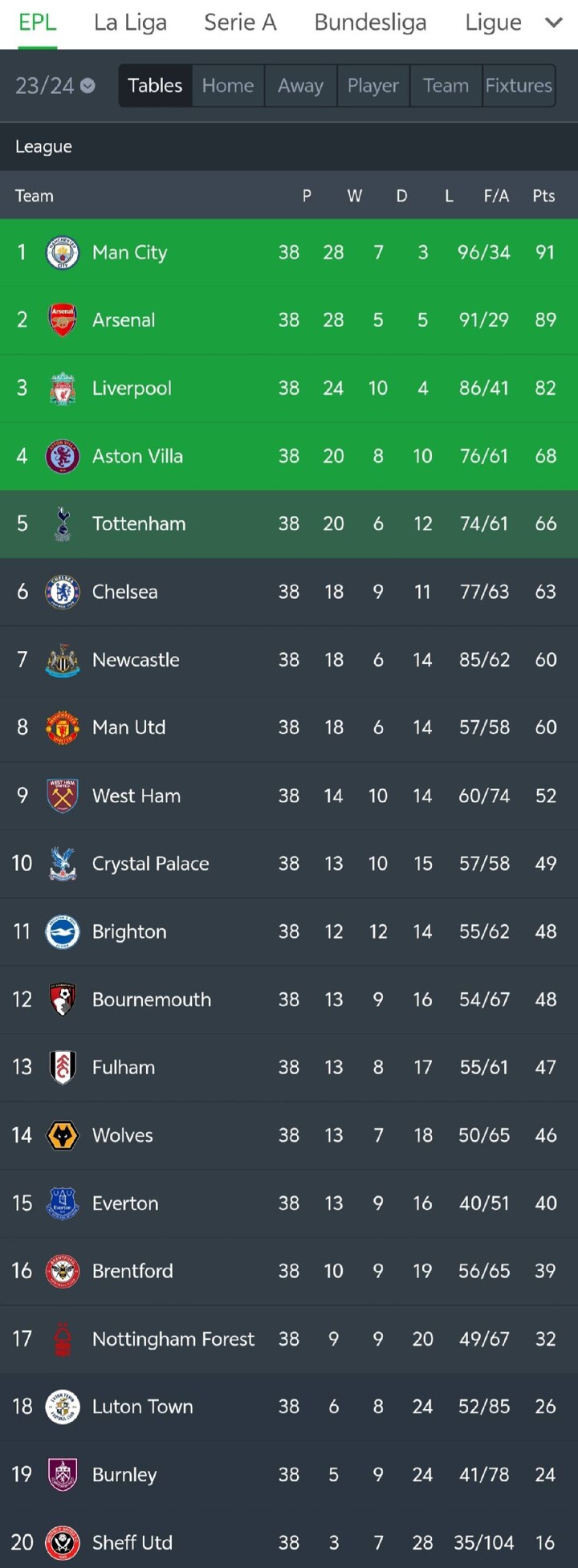The Premier League 2023/24 have come to an end. Here comes the final table of EPL this season.