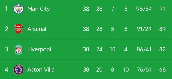 All UCL places in the Premier League this season have been confirmed: Manchester City, Arsenal, Liverpool and Villa.