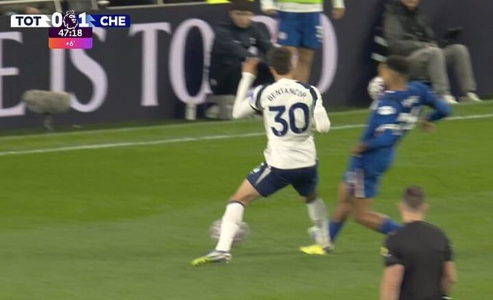 Towards the end of a feisty first half, Bentancur stopped Chelsea's counter attack with a forceful tackle on James, catching the defender on the ankle.