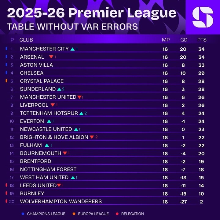 EPL table without VAR errors: Manchester City top the table, Arsenal second