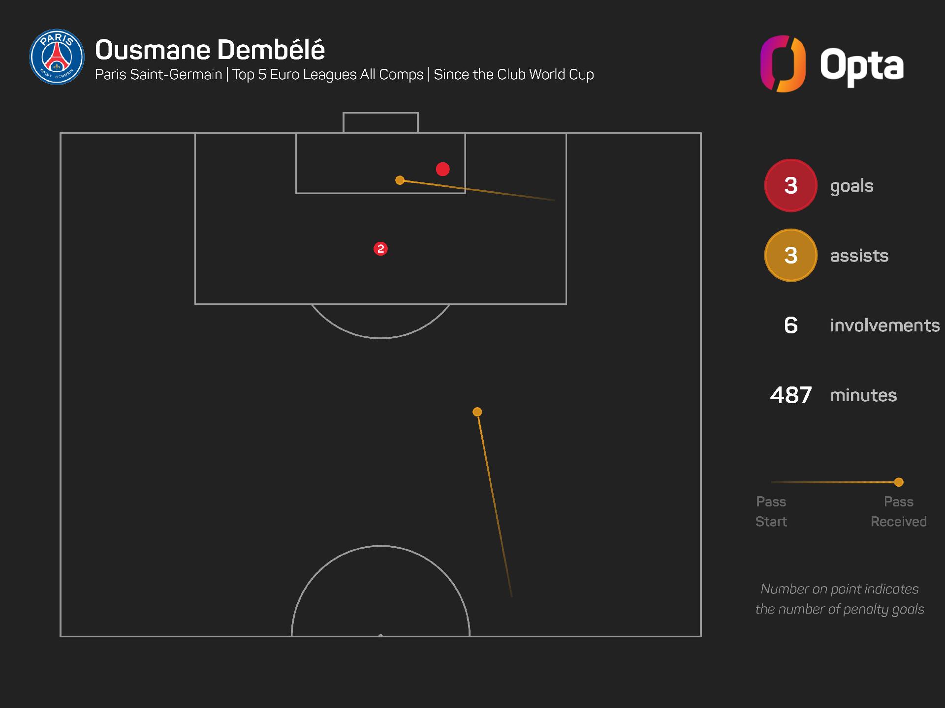 Dembele's 12 appearances have totalled just 487 minutes, though he has scored three goals and provided three assists in that limited gametime.