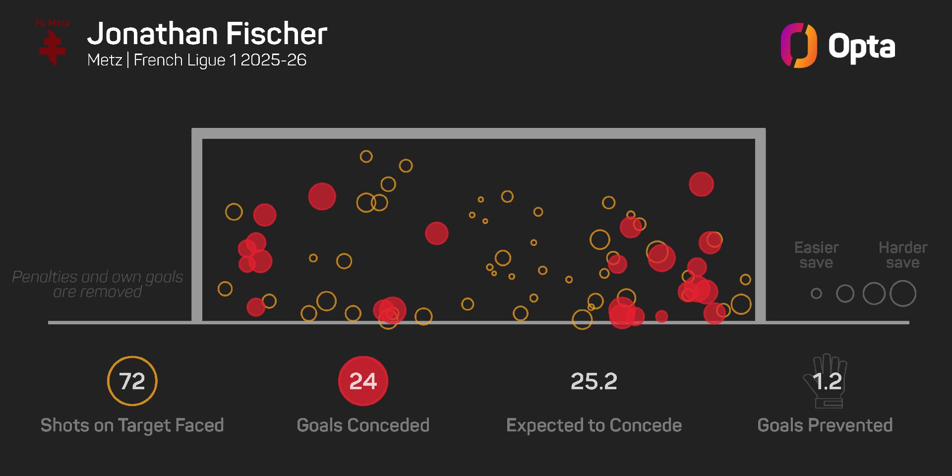 Metz goalkeeper Fischer has faced six penalties in Ligue 1 this season, more than any other goalkeeper in Europe's top five leagues.
