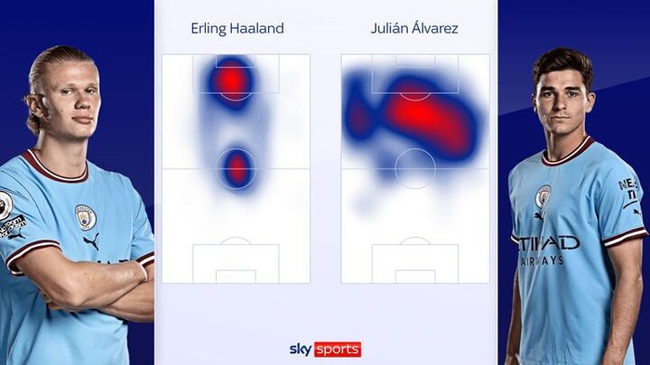 The heatmap comparison of the pair shows that most of Haaland's time on the pitch is spent in the box in between the goalposts, while Alvarez drops back into midfield and out to the wings. It's also where he scores most of his goals.