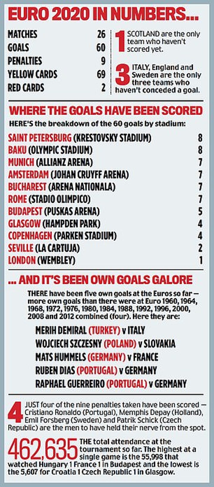 Would Gareth Southgate have taken four points from the opening two games? Probably. So why all the glum faces? Beat Czech Republic tomorrow and it’s been a very good group stage for England. OK, the performance and result against Scotland should have been better — but the fact Steve Clarke’s men were celebrating like they’d won the game tells you a lot.