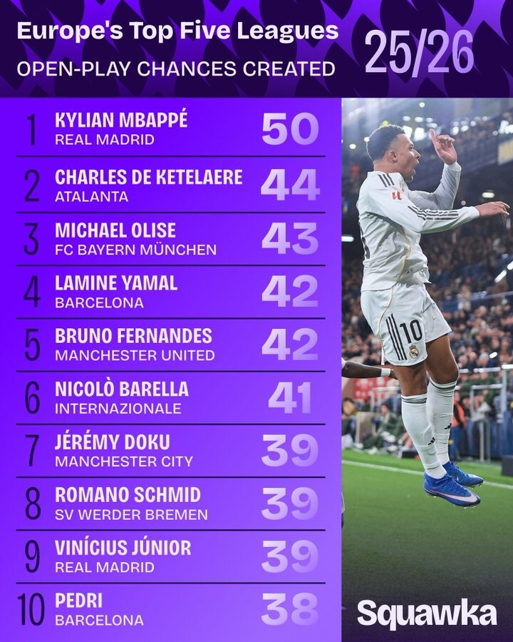 Mbappé ranks first as the only player to have created 50 or more chances from open-play.