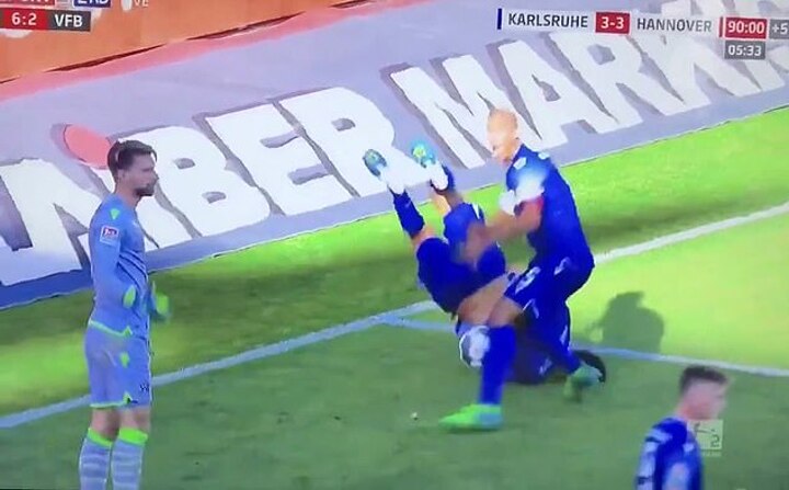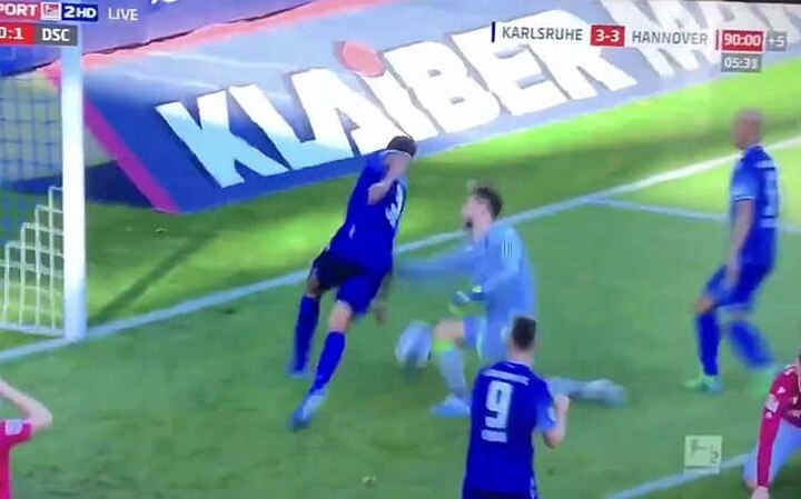 Hannover had used all their substitutes, putting defender Josip Elez in goal for the final seconds of a frantic finale to a match in which they had taken a 93rd-minute lead through German forward Hendrik Weydandt.