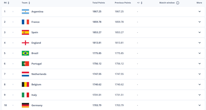 On December 19, FIFA officially released its 2024 year-end rankings. The top ten spots remained unchanged, with Argentina holding onto the top position, followed by France in second and Spain in third. England and Brazil complete the top five.