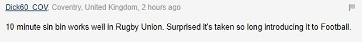 A like-minded reader added: '10 minute sin bin works well in rugby union. Surprised it's taken so long introducing it to football.'