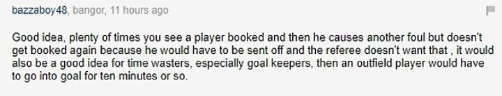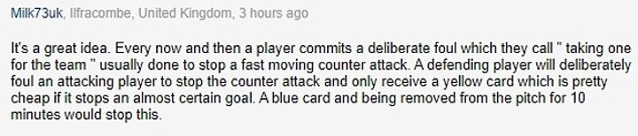 For one reader it represented a good way to crack down on cynical challenges that can rule out genuine goal scoring chances, stating: 'It's a great idea. Every now and then a player commits a deliberate foul which they call "taking one for the team" usually done to stop a fast moving counter attack.