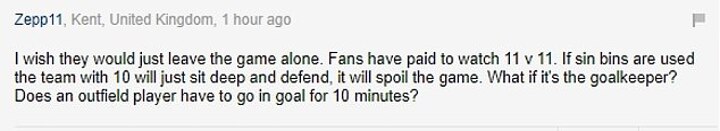 Others suggested that it would further hamper the fan experience, one reader adding: 'I wish they would just leave the game alone. Fans have paid to watch 11 v 11. If sin bins are used the team with 10 will just sit deep and defend, it will spoil the game. What if it's the goalkeeper? Does an outfield player have to go in goal for 10 minutes?