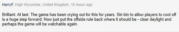 For one it represented a step in the right direction, but there are still other wrinkles to iron out before the game to become 'watchable' again: 'Brilliant. At last. The game has been crying out for this for years. Sin bin to allow players to cool off is a huge step forward.