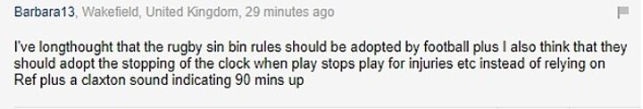 One Mail Sport reader wrote: 'I've long thought that the rugby sin bin rules should be adopted by football plus I also think that they should adopt the stopping of the clock when play stops for injuries etc instead of relying on referee plus a claxon sound indicating 90 mins up.'