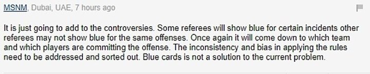 'Once again it will come down to which team and which players are committing the offense. The inconsistency and bias in applying the rules need to be addressed and sorted out. Blue cards is not a solution to the current problem.'