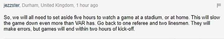 Another agreed, saying: 'So, we will all need to set aside five hours to watch a game at a stadium, or at home. This will slow the game down even more than VAR has. Go back to one referee and two linesmen. They will make errors, but games will end within two hours of kick-off.'