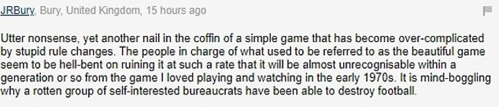 One felt it was another step towards the 'over-complication' of football, writing: Utter nonsense, yet another nail in the coffin of a simple game that has become over-complicated by stupid rule changes.