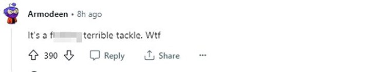 A second added: 'It’s a f***ing terrible tackle. Wtf.'