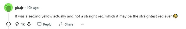 One pointed to the fact it was not a straight dismissal, writing: 'It was a second yellow actually and not a straight red, which it may be the straightest red ever.'