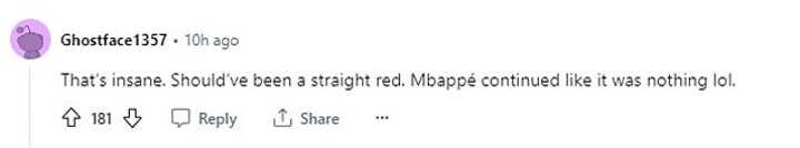 And a fifth supporter hailed the French captain's reaction, saying: 'That’s insane. Should’ve been a straight red. Mbappe continued like it was nothing lol.'
