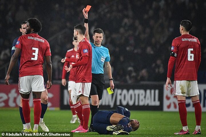Yet the Brest player was seemingly not about to let the electric Mbappe sprint away, and crunched into the PSG star's right boot.