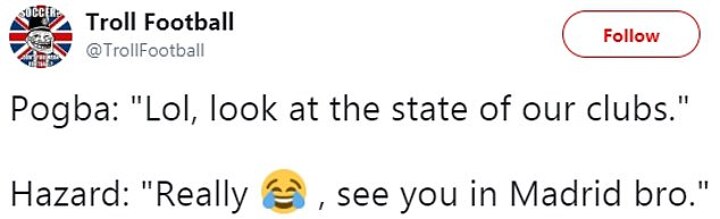 One user went into more detail, joking that Pogba had said 'look at the state of our clubs' and Hazard has responded 'see you in Madrid bro'.
