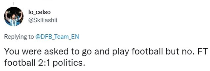 Another said: 'Don't get sidetracked by the 'politics' and just play your football. All these needless virtue signaling isn't helping you win. Germany should've won this'
