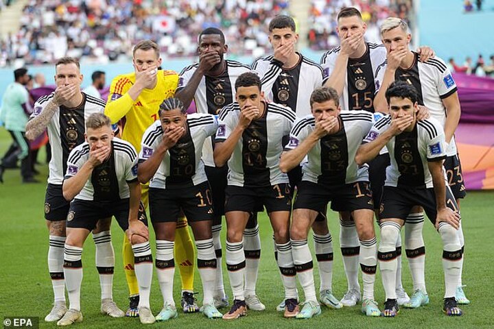 Germany's players made a statement in their pre-match team photo before their opening World Cup game with Japan as they covered their mouths in protest at being blocked from wearing an anti-discrimination armband.