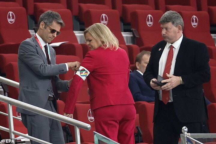 Meanwhile, watching from the stands, Germany's Interior Minister Nancy Faeser wore the armband instead. She had hidden it underneath a pink blazer, which she took off as the game began - revealing the band and its heart-shaped logo.