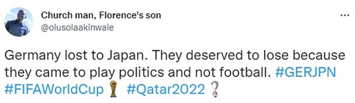 One fan wrote: 'Germany deserved that for being so obsessed with rainbow armbands and politics.'