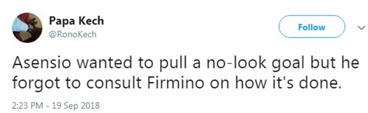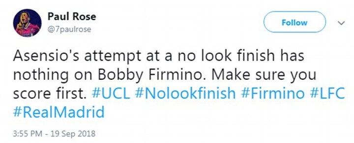 Many used the the failed effort to compare Asensio with Liverpool forward Roberto Firmino, who has built a reputation for no-look goals and passes.