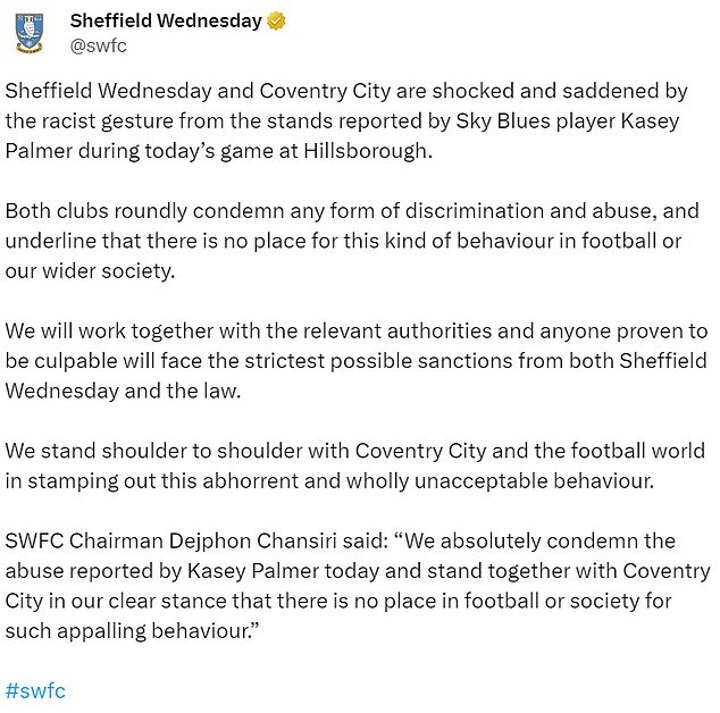 'We stand shoulder to shoulder with Coventry City and the football world in stamping out this abhorrent and wholly unacceptable behaviour.'