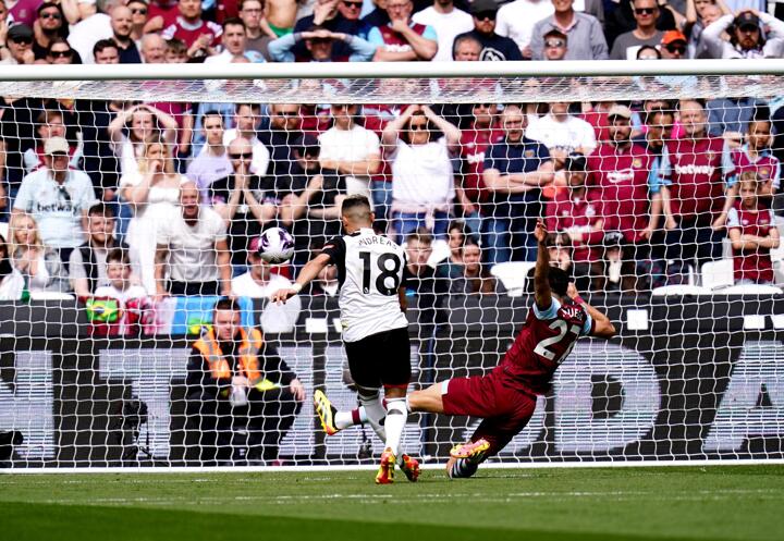 Andreas Pereira, left, scores Fulham’s first goal against West Ham
