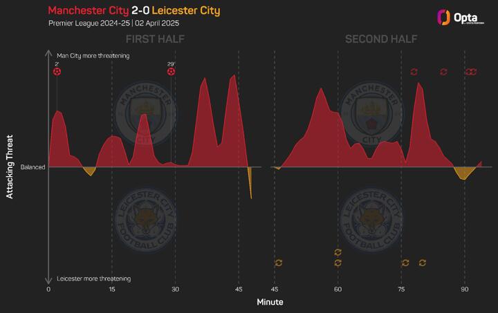 Bilal El Khannouss curled just wide to cap a rare Leicester attack, the first of just two shots the Foxes attempted in the game, but City went 2-0 up in the 29th minute.